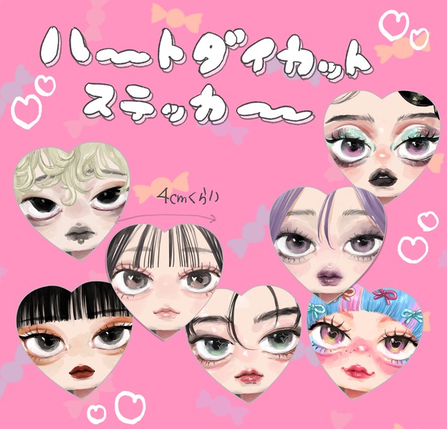 ハンバーガー屋さんの美術で使っていただいた描き下ろしハートキャンバスちゃん達をダイカットステッカーにしました! 7種のなかから3枚、ランダムでお送りします。 なにが届くか楽しみにしてね! 縦横4cmくらいです。並べても1枚でもかわいい! デコってみたよー!てのあったら見せて!